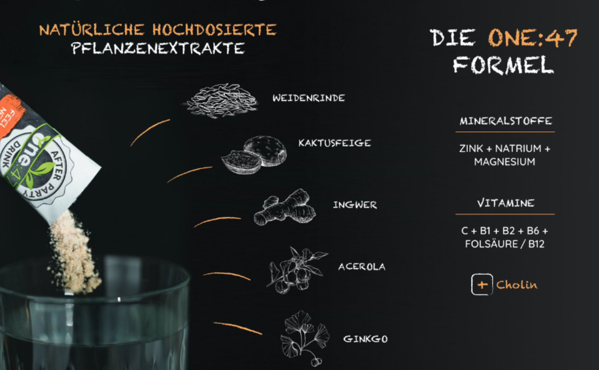one:47 ist ein Nahrungsergänzungsmittel mit Vitaminen, Elektrolyten und hochkonzentrierten Pflanzenextrakten. one:47 verbindet so natürliche Inhaltsstoffe mit einem cleveren Rehydrationprodukt und ist dabei noch vegan, glutenfrei und ohne künstliche Farb- oder Geschmacksstoffe.